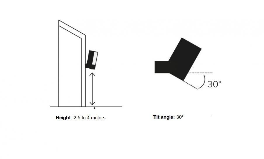 - Installation at a height of 2.5 to 4 metres with a 30° tilting angle is recommended